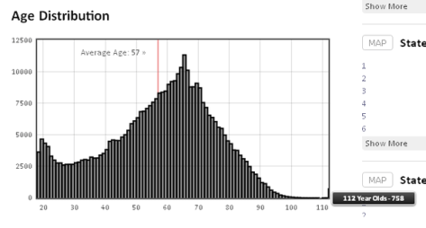 In visiting the political tracking site, we later found the same story in evidence, except the number of centenarian voters had increased measurably to 832 voters over the age of 112. Of these voters, over 70% were slated as Democrats, with a diminutive 25% counted as Republicans. The rest were unaffiliated.