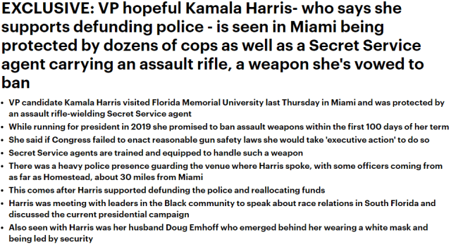 Kamala Harris protected with massive police detail she promises to defund; carrying AR-15’s she promises to ban