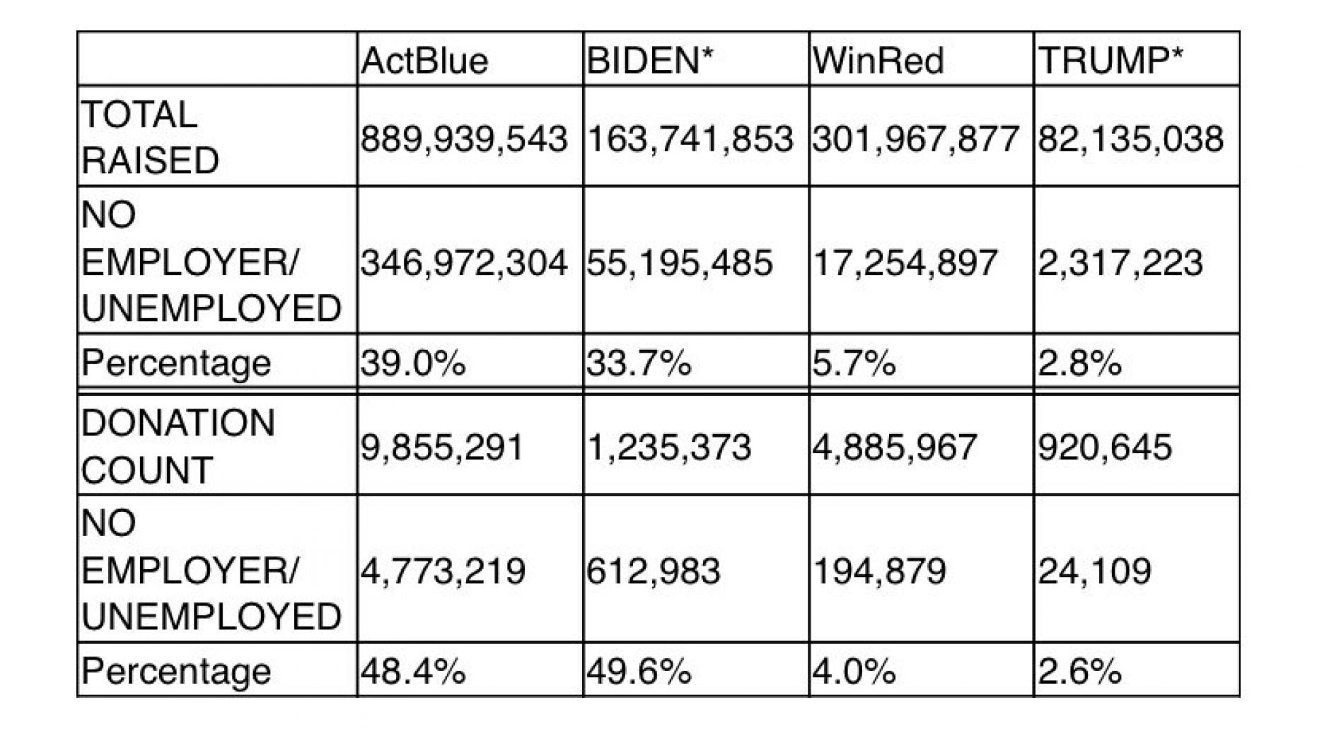 According to the findings of the Action Fund – a nonprofit that aims to “educate the public on conservative solutions for political reform” – 48.4% of ActBlue donations last year, prior to the massive loss of jobs that came with the onslaught of the coronavirus pandemic, came from those who did not list an employer or who claimed to be unemployed.