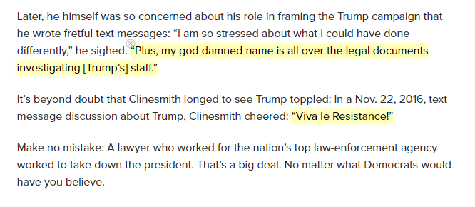 Durham did not lean on Clinesmith at all to get other bad actors and criminals in the FBI such as Peter Strzok, James Comedy, and Andrew McCabe. Rather the FBI sentencing memorandum recommended six months in jail. By Contrast they threw the book at George Papadopoulos for misremembering a detail about another FBI paid liar Josef Mifsud and the same DoJ asked the judge to give Roger Stone eight years in prison for lying about something that turned out to be inconsequential to Congress. The difference is that Papadopoulos and Stone supported Trump and Kevin Clinesmith is a self proclaimed member of “The Resistance”.