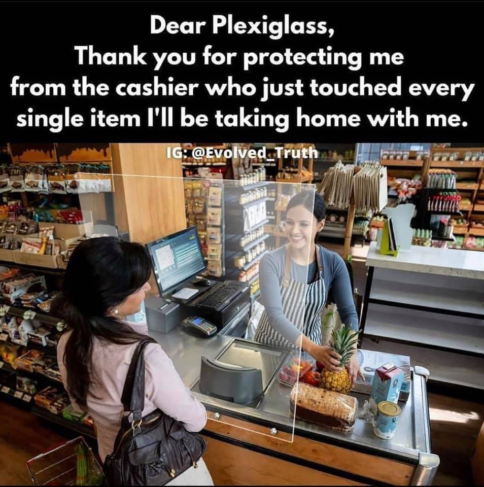 Does the plexiglass really make a big difference? The cashier is touching all your items….right after you just touched and breathed all over those items right in front of you in your cart as you walked through the entire store….so the cashier really isn’t so well protected is she?