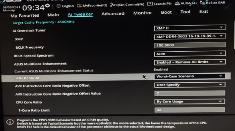 Notice the setting “CPU Cache Ratio” this sets the maximum speed of the CPU cache memory. The default fastest is 4.3ghz. A slight boost to this setting really makes an impact. With a pristine chip 4.6-4.7ghz is possible, but for some of us 4.4-4.5ghz is the best we can hope for and maintain stability.