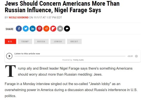 The Newsweek piece says that Farage claimed that Israeli influence is more than the Kremlin and advanced the Trump/Russian influence hoax and the second actually has the word “anti-Semitism” right at the top.