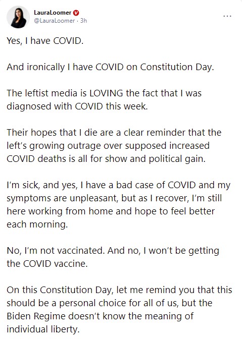 Last year, Loomer said she wanted to “get COVID” just to prove she’d had “bouts of food poisoning that are more serious and life threatening than a hyped up virus.”