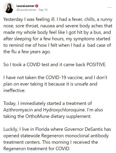 Last year, Loomer said she wanted to “get COVID” just to prove she’d had “bouts of food poisoning that are more serious and life threatening than a hyped up virus.”