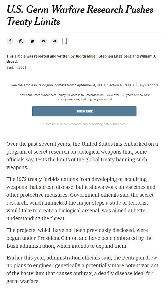 The New York Times revealed the existence of these labs in 2001 describing how the US is skirting international treaties banning such research: