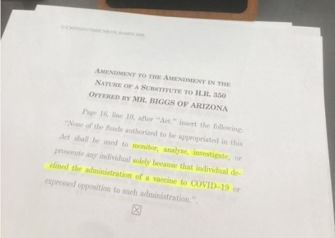 Rep. Thomas Massie broke the news of the party line vote amidst a Judiciary Committee debate over a domestic terrorism bill via Twitter, revealing “Due to a troubling DHS bulletin, @RepAndyBiggsAZ offered an amendment to prevent the targeting of Americans due to their views on COVID vax.”