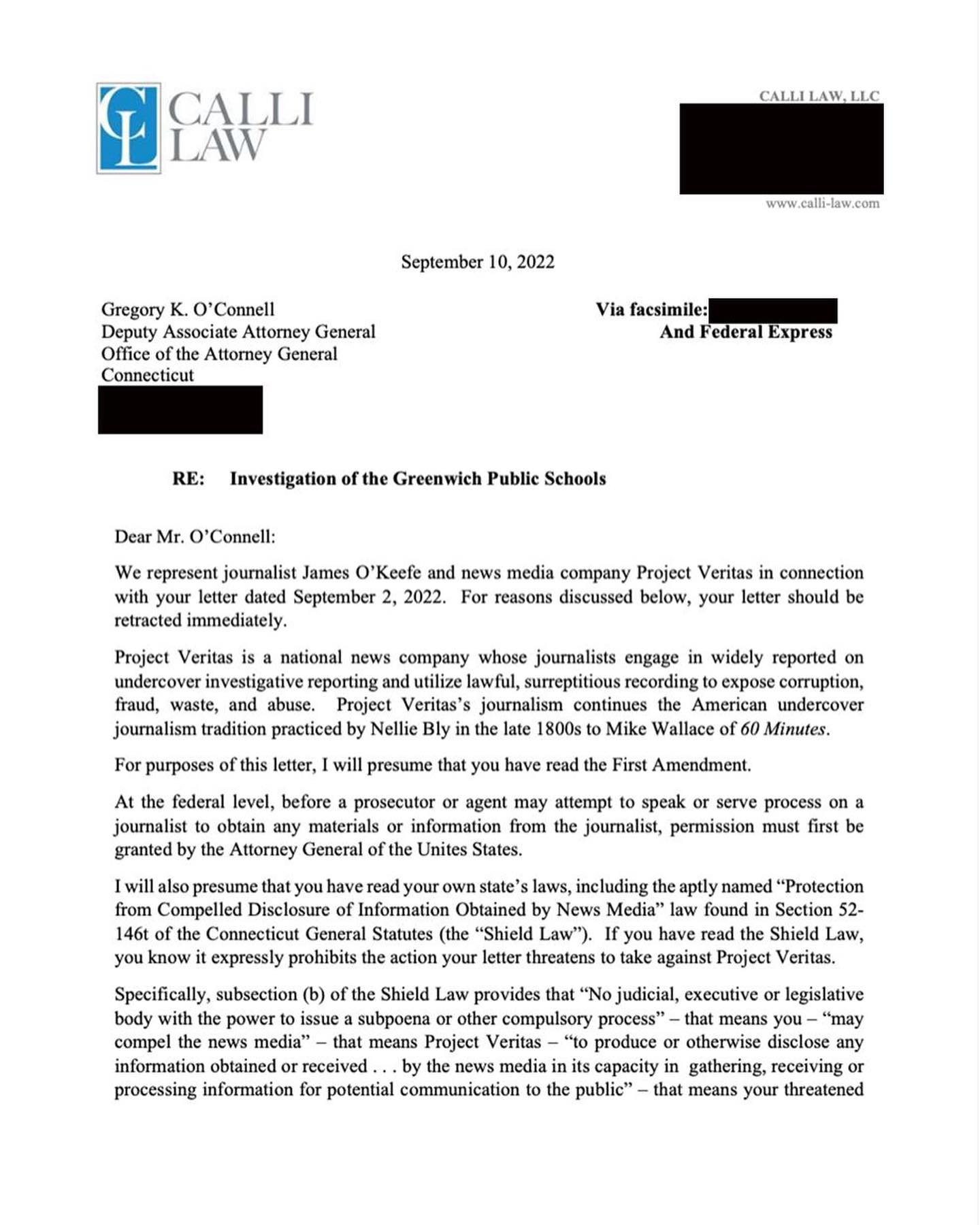 Project Veritas response to Conn AG letter1 September 12, 2022 1440 × 1800 Project Veritas to Connecticut AG After Investigation Threat: Stay In Your Lane and Do What Citizens Expect of You