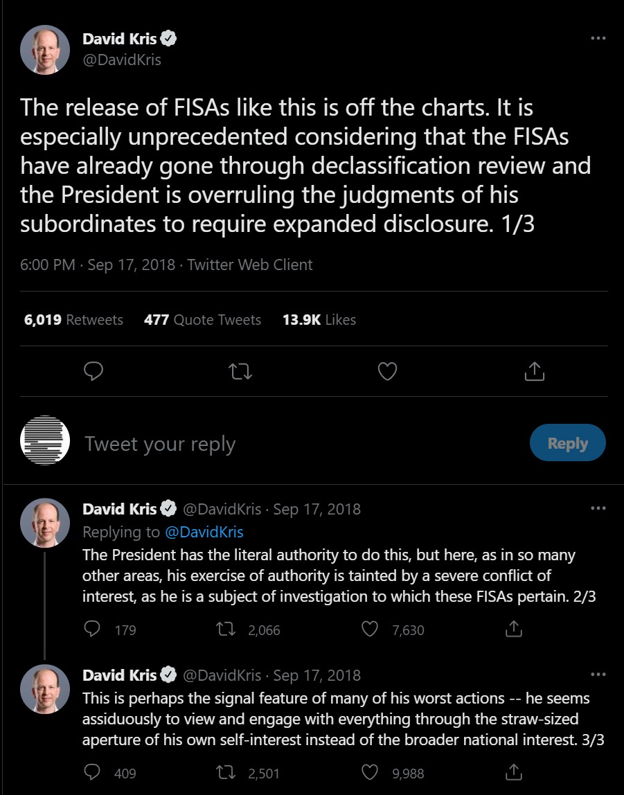 The Department of Justice (DoJ) asserts that having a special mater appointed will do grievous harm to the country and the people. We have heard that before. When the Trump Administration declassified the FISA filings that showed how the FBI/DoJ lied to the court repeatedly in order to spy on Trump and attempt to set him up as a traitor working for Vladimir Putin, they said the same thing as you can see in the tweets below.