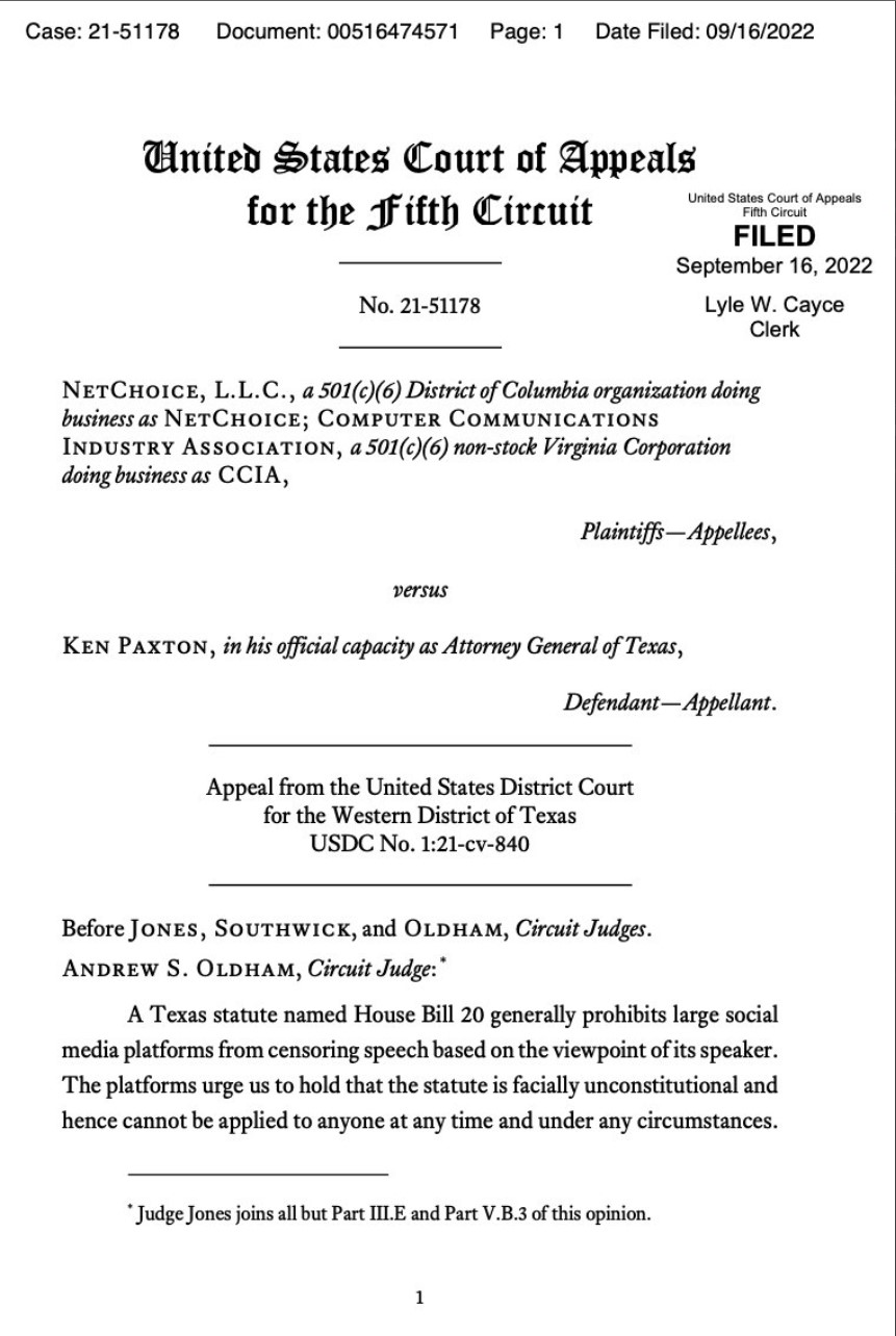5th circuit court texas social media free speech 2 September 23, 2022 861 × 1284 5th Circuit Court Upholds Texas Law Prohibiting Viewpoint Censorship on Social Media