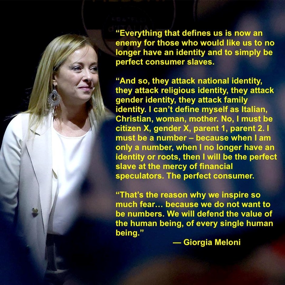 Meloni also speaks a great deal about family and traditional Western values that set us up to be free and prosperous in the first place. There is a reason that the self professed Marxist BLM organization stated that one of their primary goals was the destruction of the traditional nuclear family.