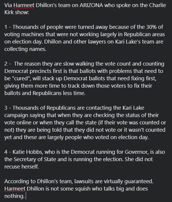 I didn't vote for Kari Lake, but when her opponent is in charge of running the election and counting votes and a bunch of voting machines go down on election day and then it takes a week to count the votes and the votes come out in favor of the opponent, well… 🤔