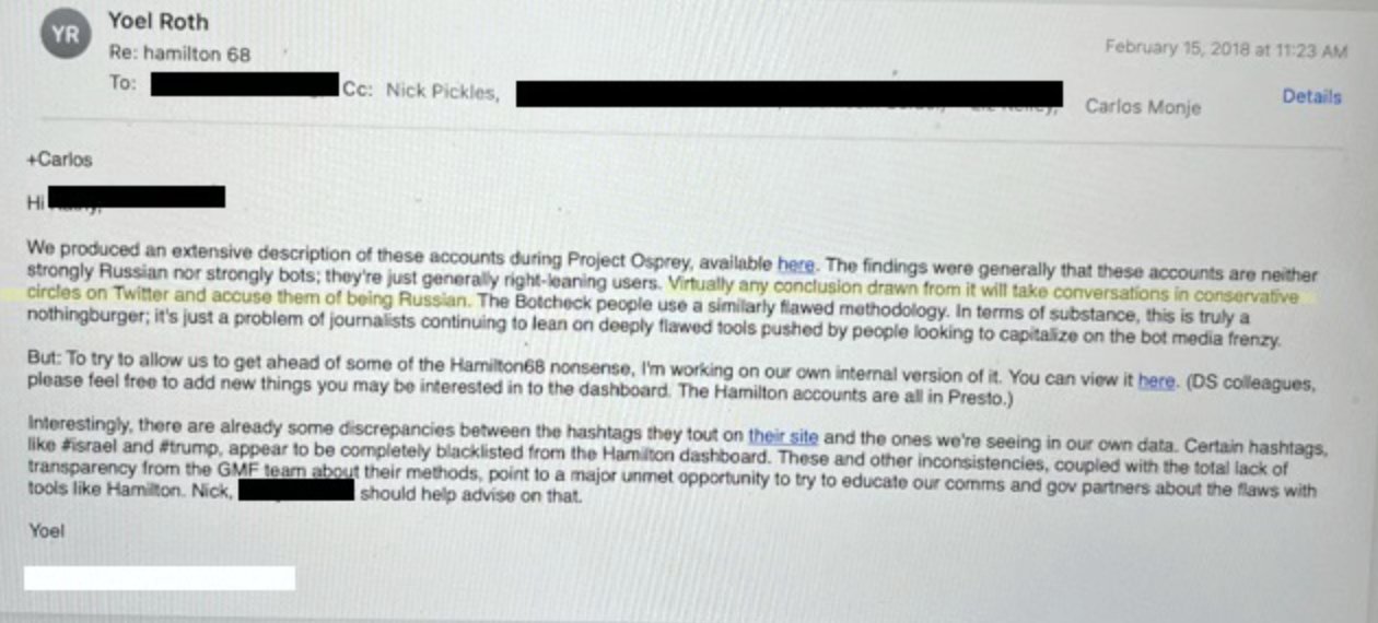Released internal Twitter emails show that even Twitter knew that Hamilton 68 was a fraud, but since they were working with the Intelligence Community they went along with it anyways.