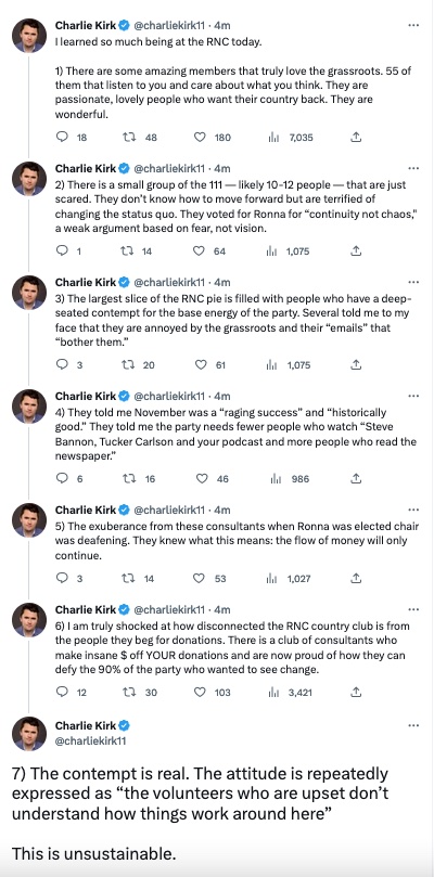 Grassroots voters and donors have also not forgotten how the RNC raised over $300 million to help Trump fight election integrity battles (we all received those fund raising emails), but kept that money while pressuring Trump’s lawyers to stop opposing Democrats in court.