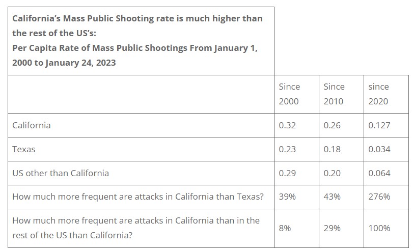 After the California Supreme Court declared the state’s assault weapon ban unconstitutional in 1998, a new law was enacted in 2000. Picking just a few years from 2019 to 2021 to evaluate the law seems arbitrary. Whether one picks the years from 2000 on, 2010 on, or 2020 on, the per capita rate of mass public shootings in California is always greater than the rate for the rest of the country. The rate has also been consistently lower in Texas, which gun control groups give an “F” grade for its gun control laws. From 2010 on, California’s per capita rate of mass public shootings was 43% higher than the rate in Texas and 29% higher than in the rest of the United States. Since 2020, the rate in California is 276% higher than in Texas and 100% higher than in the rest of the U.S..