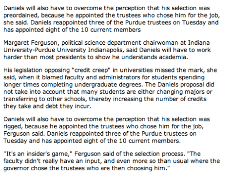 The loathsome LoBianco and Coyne burned an awful lot of bandwidth questioning Daniels’s supposed lack of academic credentials. Hmm — the three Democratic Party examples I’ll name predate the Twitter era, but I wonder if AP reporters tried as hard to get negative feedback about Nebraska Senator Bob Kerrey when he became President of the New School in 2001, former HHS Secretary Donna Shalala when she took over at the University of Miami in Florida that same year, or former Senator David Boren when he got the CEO role at Oklahoma University in 1994?