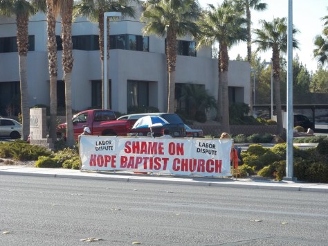 Although details are lacking, the above pic was e-mailed stating that the Southwest Regional Council of Carpenters has replaced its banner outside Hope Baptist Church (in Las Vegas) and is now being manned by non-union temp. labor. [Apparently, a church should not be using non-union labor, but a union can?] According to the e-mail, the union’s prior banner stated “Shame on God.”